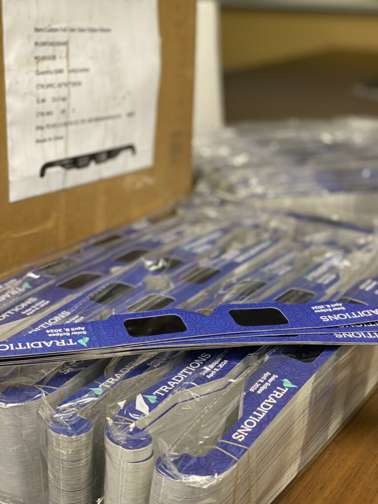 Unfortunately, there will be sellers and resellers trying to capitalize on this rare event and will sell glasses that might not have the proper level of protection. One way to check is to look for the ISO number. It should say ISO 12312-2 (sometimes written as ISO 12312-2:2015). If you are a resident of a Traditions community, your team has glasses ready for you!