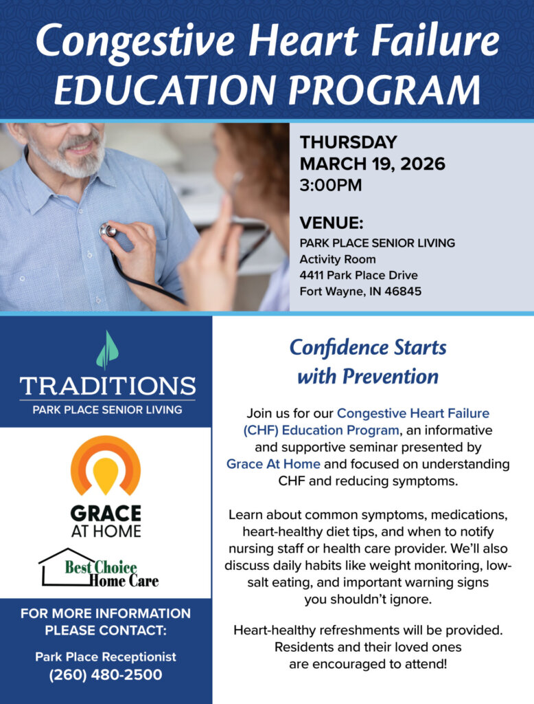 Join us for our Congestive Heart Failure (CHF) Education Program, an informative and supportive seminar presented by Grace At Home and focused on understanding CHF and reducing symptoms.
