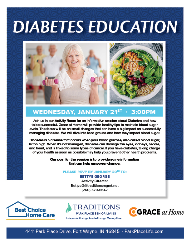 Join us in our Activity Room for an informative session about Diabetes and how to be successful. Grace at Home will provide healthy tips to maintain blood sugar levels. The focus will be on small changes that can have a big impact on successfully managing diabetes. We will dive into food groups and how they impact blood sugar.